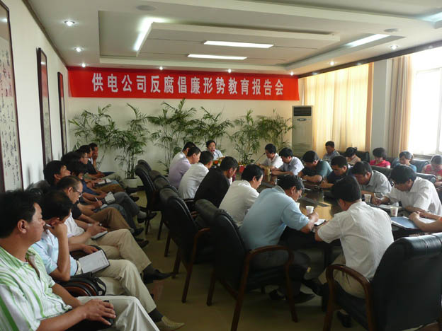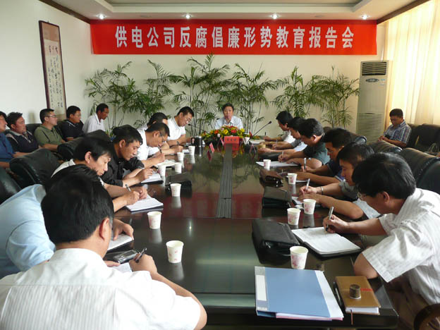 近日,我公司邀請(qǐng)了市紀(jì)委常委、市紀(jì)委秘書長(zhǎng)、市監(jiān)察局副局長(zhǎng)雷生保同志來(lái)我公司作反腐倡廉形勢(shì)教育報(bào)告,公司領(lǐng)導(dǎo)、機(jī)關(guān)中層干部、各供電所領(lǐng)導(dǎo)班子及部分職工代表參加了會(huì)議。