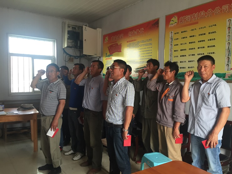 會(huì)議最后新河支部全體黨員重溫入黨誓詞。新河黨支部全體黨員起立。由支部書(shū)記李加新同志帶領(lǐng)大家宣讀誓詞。(新河支部程龍)