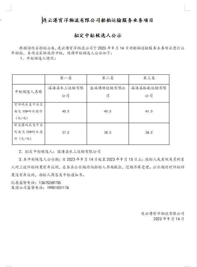 連云港宵洋物流有限公司船舶運輸服務業(yè)務項目擬定中標候選人公示