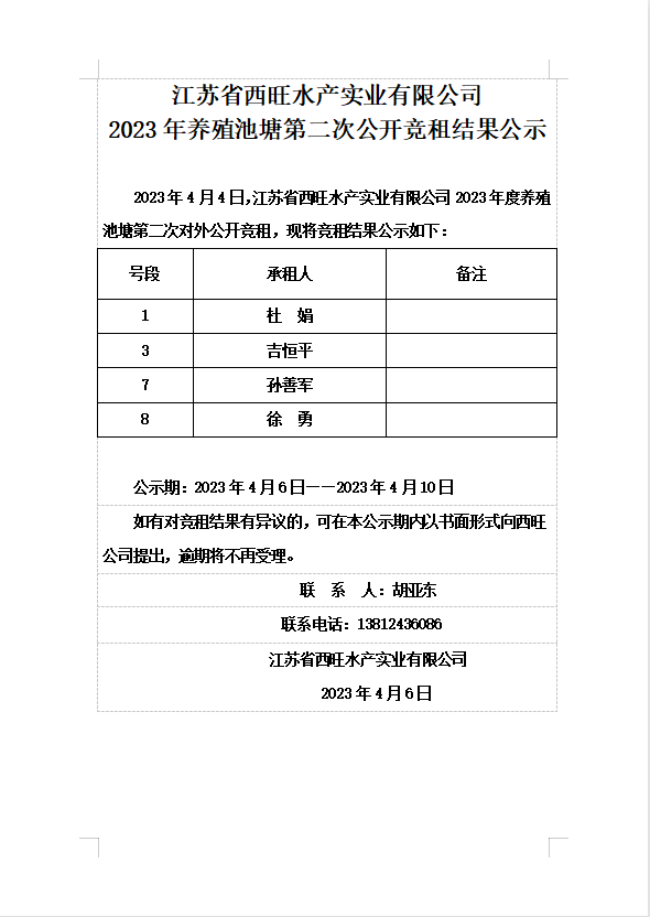 江蘇省西旺水產(chǎn)實(shí)業(yè)有限公司2023年養(yǎng)殖池塘第二次公開競租結(jié)果公示