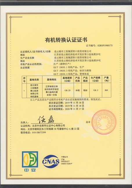 11月25日上午,我公司種植的“南粳9108”有機大米經(jīng)過嚴格認真的檢測和審核,獲得北京中安質(zhì)環(huán)認證中心頒發(fā)的有機轉(zhuǎn)換認證證書。